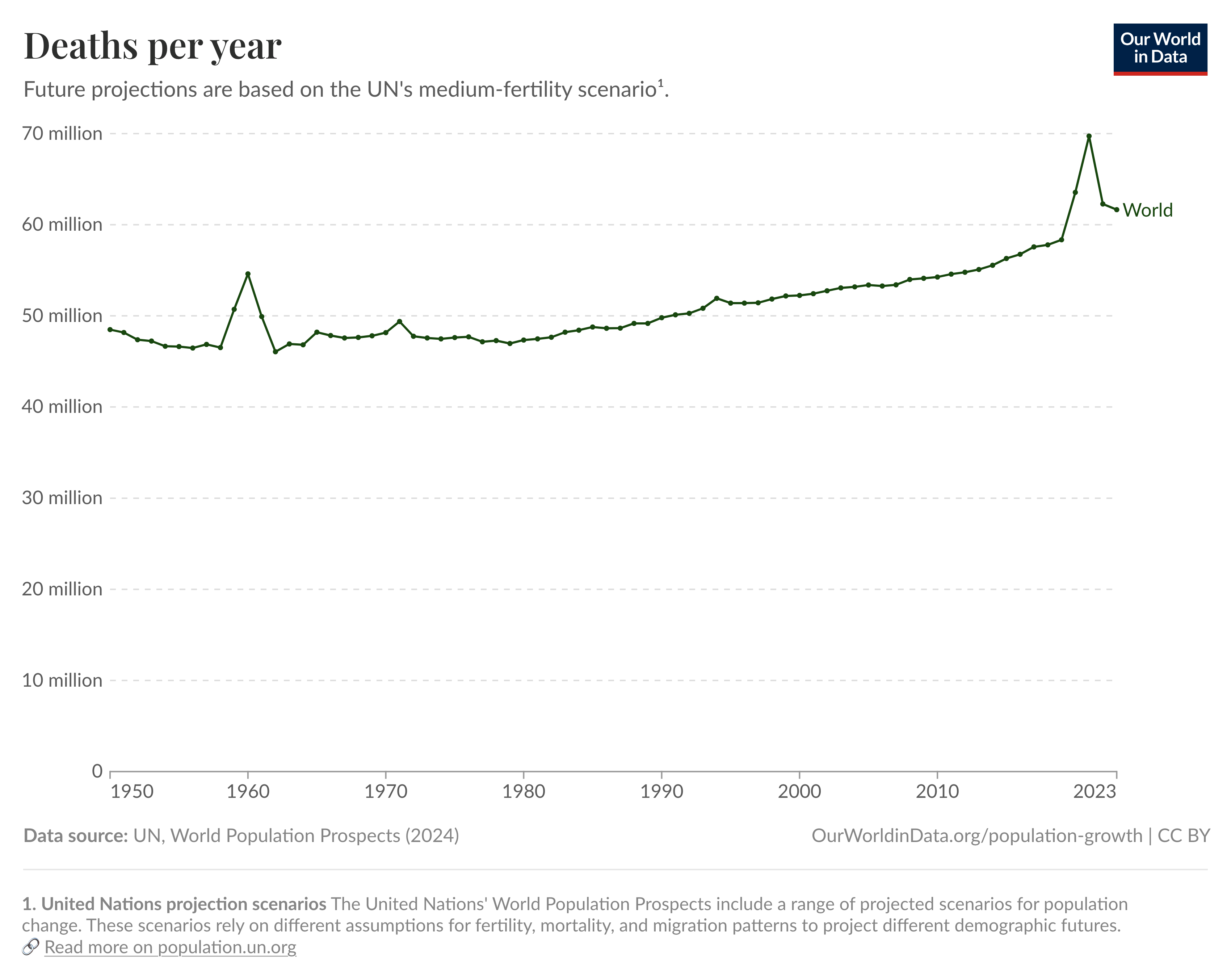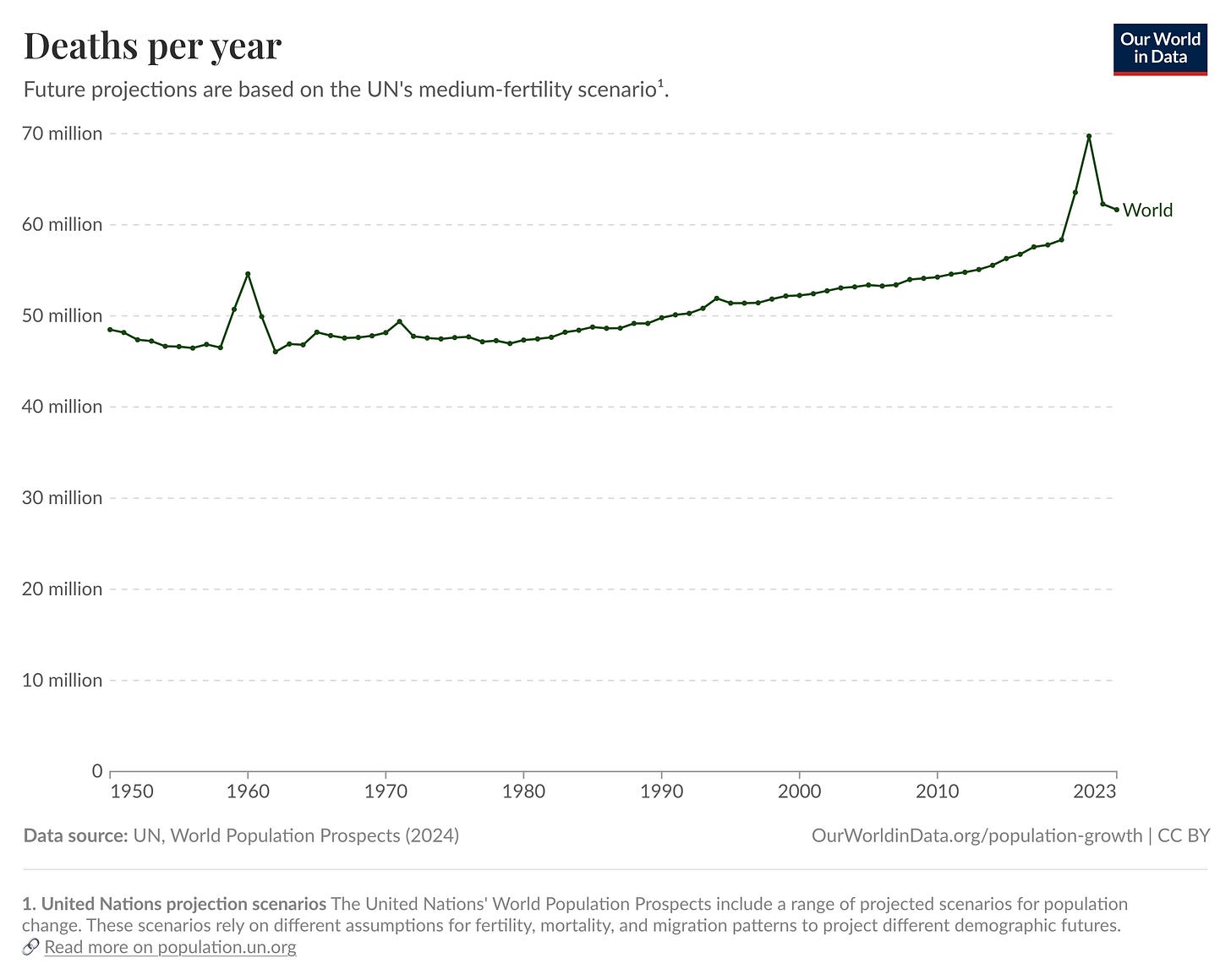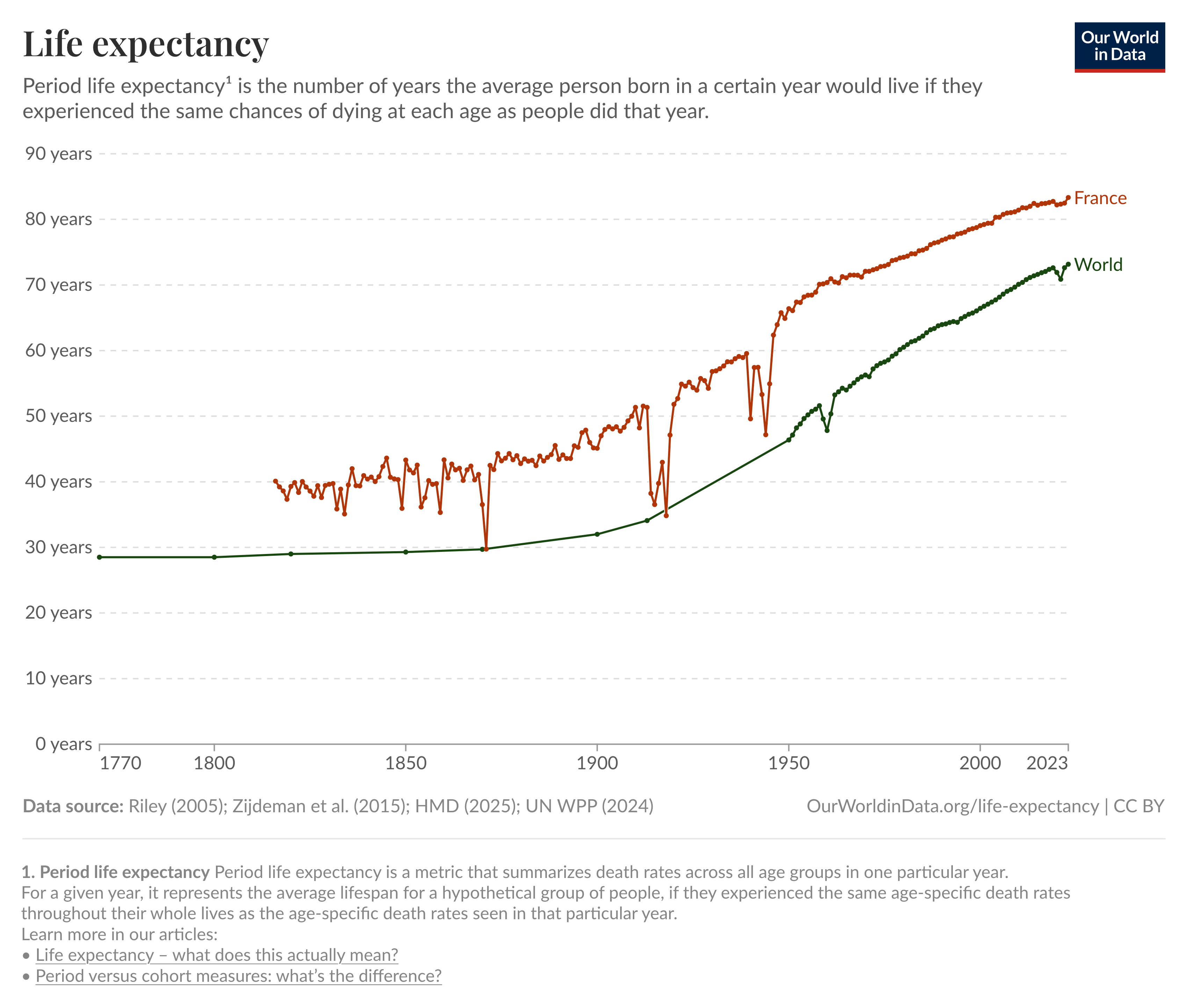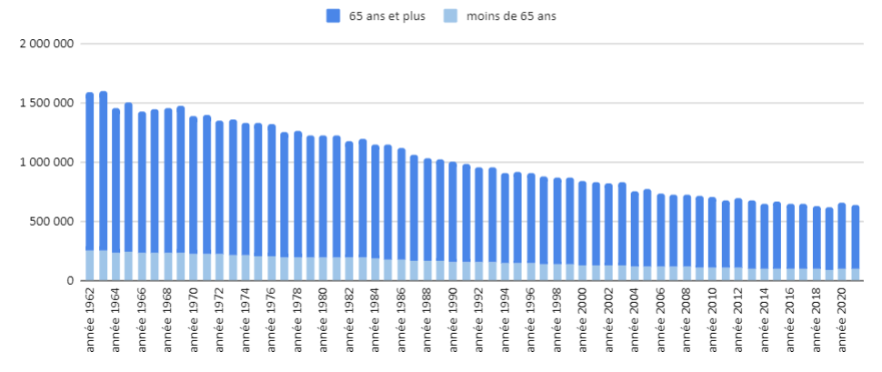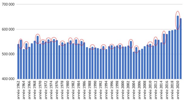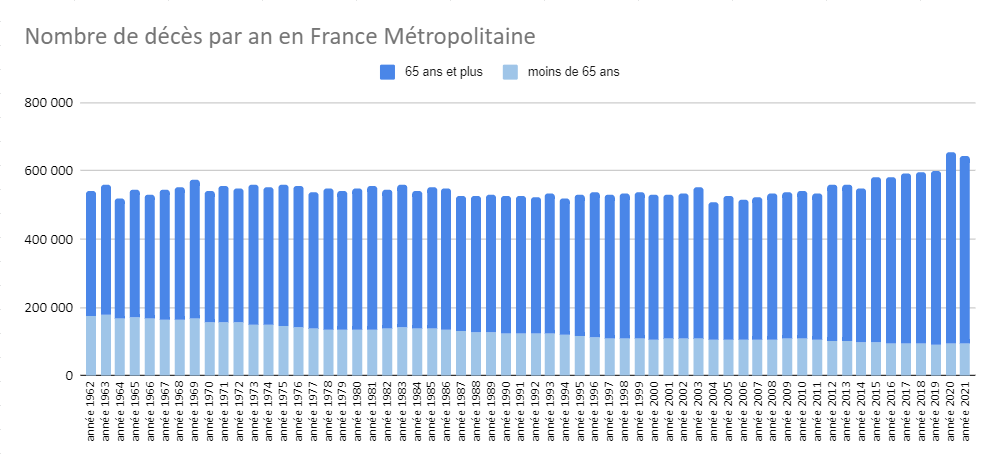 This reasoning is flawed. Life expectancy has grown continuously—people live longer now than they did five, twenty, or fifty years ago. Therefore the French age distribution for 2020 is intrinsically linked to medical progress. In 1962, a 70-year-old had a significantly lower chance of survival than in 2020. Standardizing death by 2020 means applying a proportion of death per age bracket from the previous years—that was obviously higher—using a more recent and older demographic distribution that wouldn’t be possible at that time.